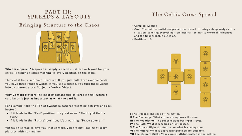 - The Spreads Library: 5 essential layouts with perfect geometry, including the Celtic Cross, The Relationship Mirror, and the Fork in the Road decision maker.